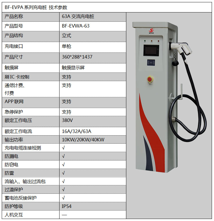 BF-EVPA系列产品主要用于对电动汽车进行快速充电,其设计采用高性能ARM芯片,具有防漏电、防雷、防窃电灯功能,防护等级为IP54,同时该产品将充电接口、人机交互界面、通信、计费等部分集成为一个整体,采用模块化设计,具有安装调试方便、运行维护简单等特点,与充电机配合使用,是电动汽车户外交流充电的理想选择。