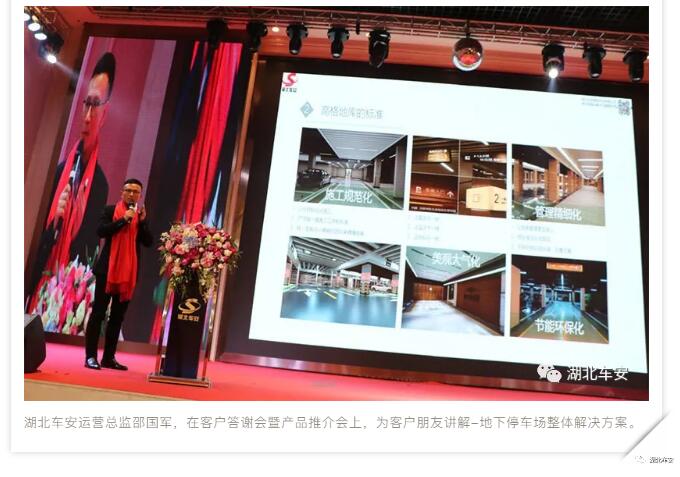 湖北车安运营总监邵国军,在客户答谢会暨产品推介会上,为客户朋友讲解-地下停车场整体解决方案。