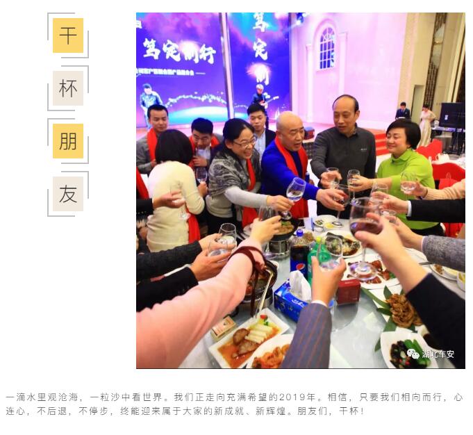 一滴水里观沧海,一粒沙中看世界。我们正走向充满希望的2019年。相信,只要我们相向而行,心连心,不后退,不停步,终能迎来属于大家的新成就、新辉煌。朋友们,干杯!