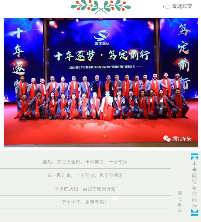客户朋友从四面八方聚集而来,陪伴湖北车安在这特殊的一天回顾过去的十年,从新生到热忱,从彷徨到笃定,感恩客户朋友的一如既往的支持与帮助。湖北车安人带着新品推介方案及初心与客户朋友们共同开启2019年新的篇章。