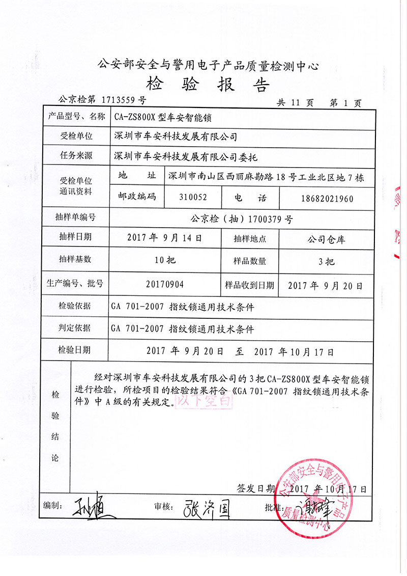 车安科技智能锁,除了出厂前的各种极端测试外,全系列产品都通过国家安全防范报警系统公安部安全与警用电子产品质量的全部检测!