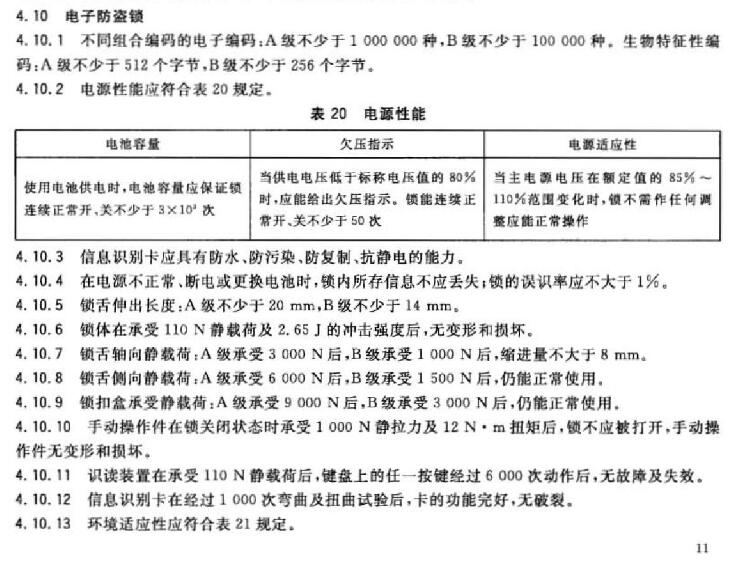 标准涵盖了目前市场上流通的绝大部分民用锁具,其中4.10章节对电子防盗门锁做出了相应的要求,这是电子防盗门锁类的及格线。
