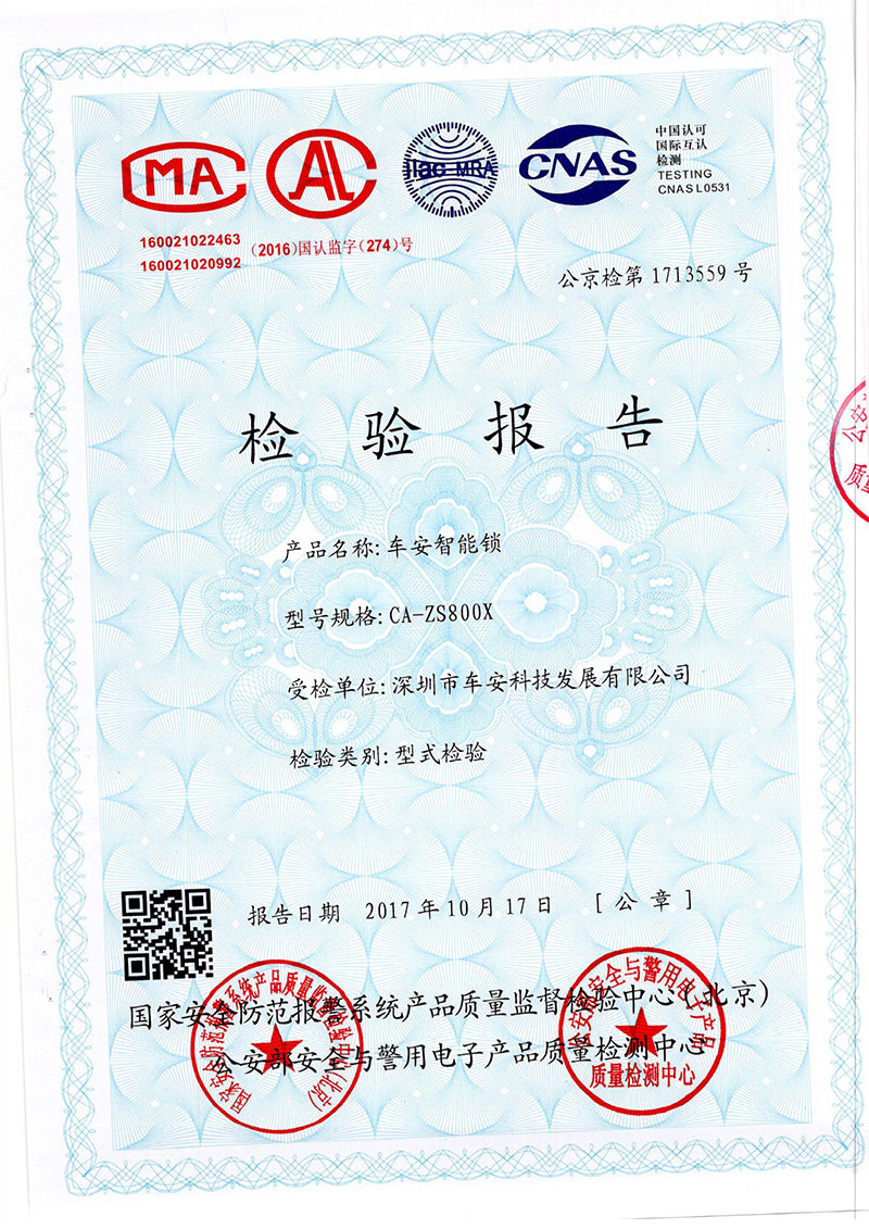 而且车安智能锁除了出厂前的各种极端测试外,全系都通过国家安全防范报警系统,公安部安全与警用电子产品质量的全部检测!